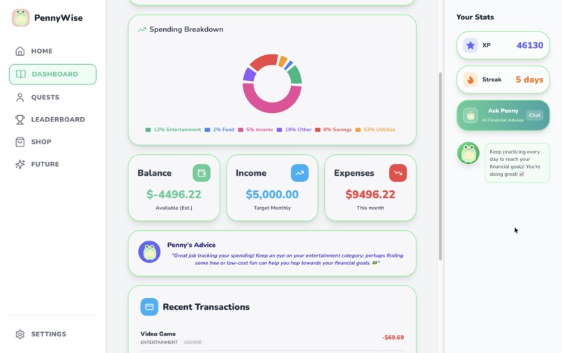 A full-stack web application that gamifies financial literacy for college students, integrated with Capital One's Nessie API and built during the SwampHacks XI! Turn your financial habits into a game. Earn XP for real-world spending, tackle financial quests, and redeem your progress for gift cards and banking perks. It’s accessible, engaging, and designed for real impact.